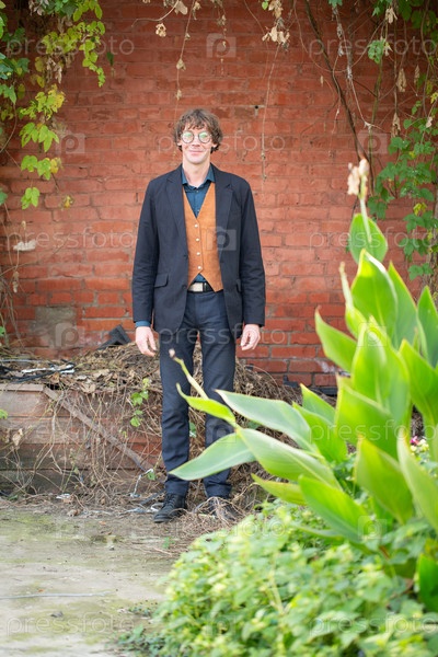Мужчина в модной одежде и очках позирует возле кирпичной стены