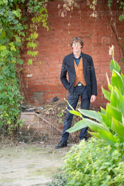 Мужчина в модной одежде и очках позирует возле кирпичной стены