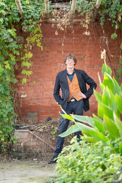 Мужчина в модной одежде и очках позирует возле кирпичной стены
