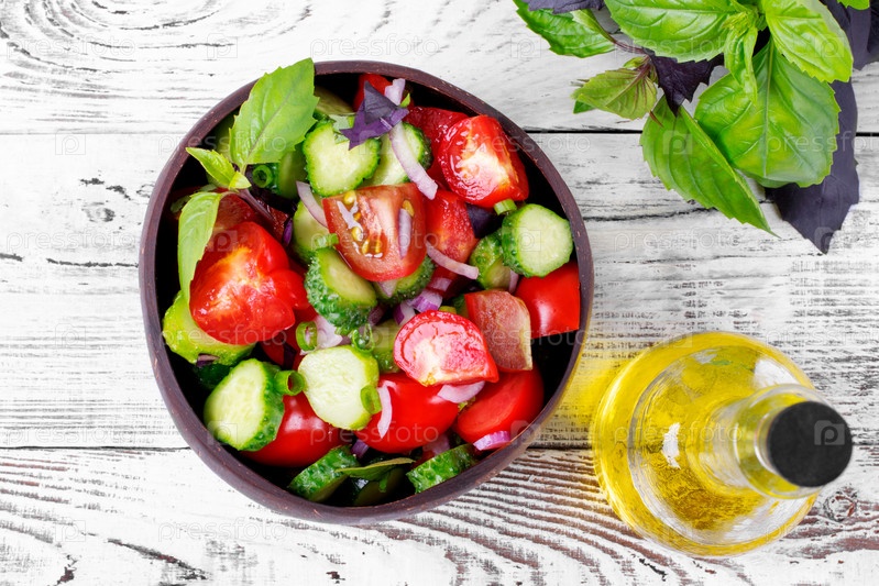 Салат с огурцами, помидорами, базиликом, красным луком и оливковым маслом в деревянной миске на белом столе