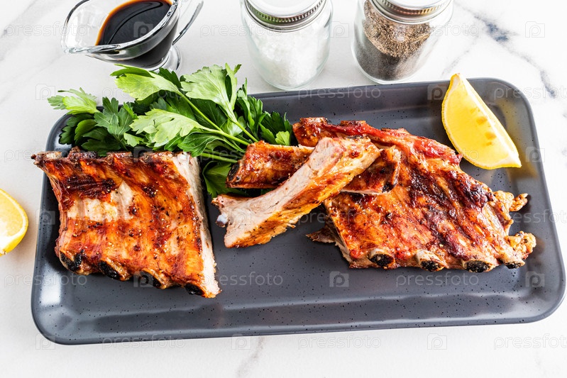 Порционные свиные ребрышки на гриле на прямоугольной керамической тарелке с петрушкой и ломтиком лимона. изысканный вкус еды. меню