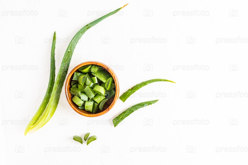 Вид сверху на деревянную миску с кусочками растения алоэ вера и листьями на белом фоне. плоская укладка. лекарственное растение. альтернатива медицине