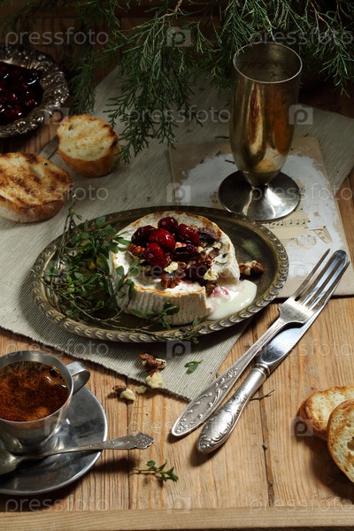Камамбер с жареным багетом и ягодным джемом