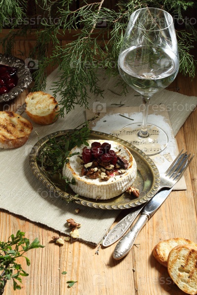Камамбер с жареным багетом и ягодным джемом