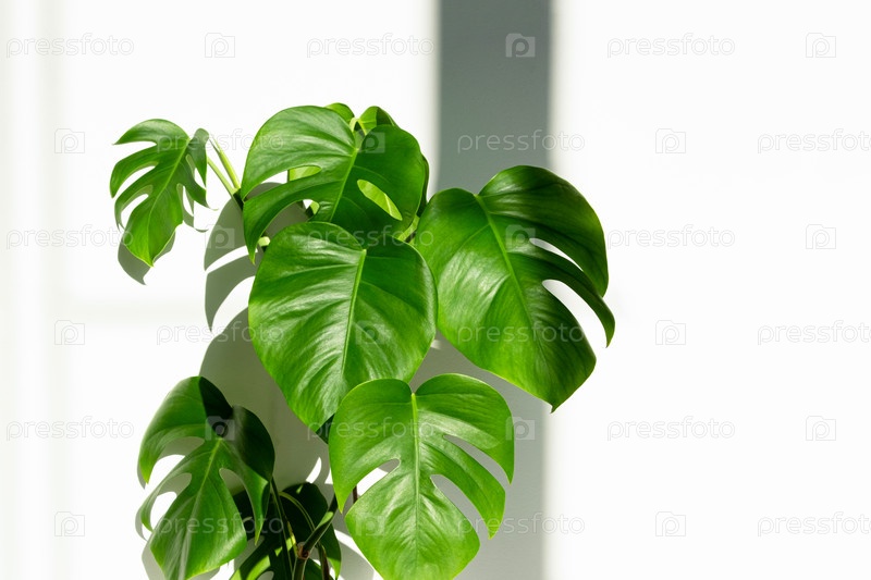 Растение монстера в белом горшке на белом изолированном фоне. Концепция минимализма. Листья монстеры деликатесной или швейцарский сырный завод на фоне тропических листьев в горшке. резкие тени