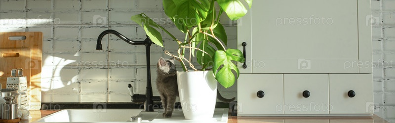 Растение монстера в белом горшке на белой кухне и маленькая серая домашняя кошка. Концепция комнатных растений и домашних животных. Листья монстеры деликатесной или тропические листья швейцарского сыра