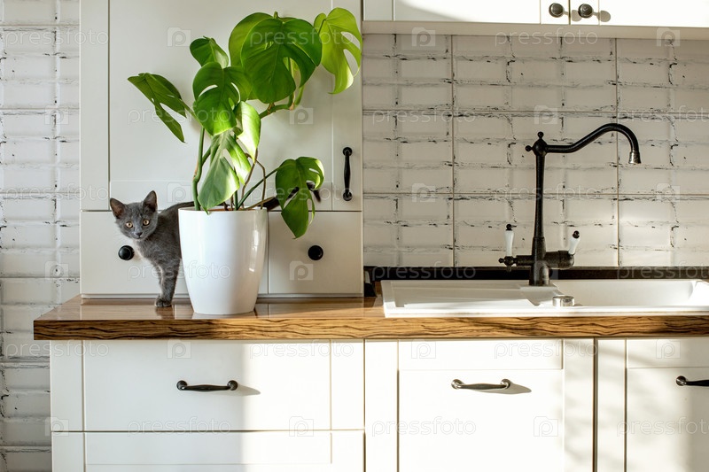 Растение монстера в белом горшке на белой кухне и маленькая серая домашняя кошка. Концепция комнатных растений и домашних животных. Листья монстеры деликатесной или тропические листья швейцарского сыра