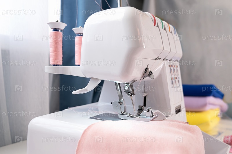 Оверлок. пошив одежды на швейной машине в домашних условиях. Швея работает. Ручное изготовление одежды в домашнем интерьере. Женщина сидит, наслаждаясь процессом шитья одежды. дизайн творческих навыков, хобби и концепция малого бизнеса