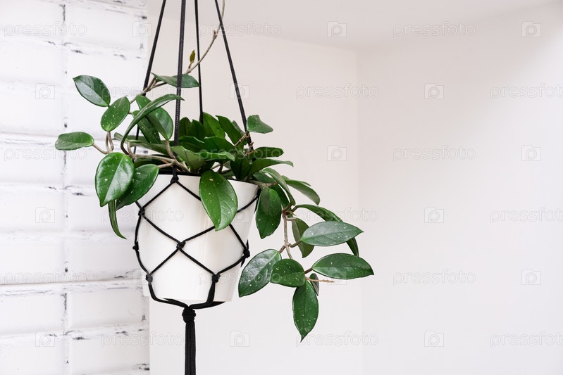 Hoya krohniana в белом горшке в плетеном плантаторе макрама, висящая на белом фоне. lacunosa сердечный лист. крупный план растения. восковое растение в горшке