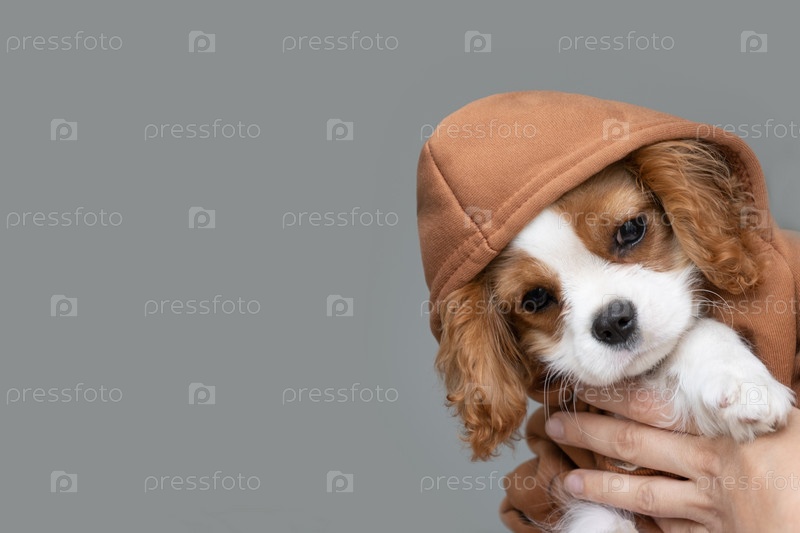 Портрет крупным планом милого щенка в коричневой толстовке с капюшоном. Осенняя и зимняя одежда для домашних животных. Кавалер-кинг-чарльз-спаниель Бленхейм