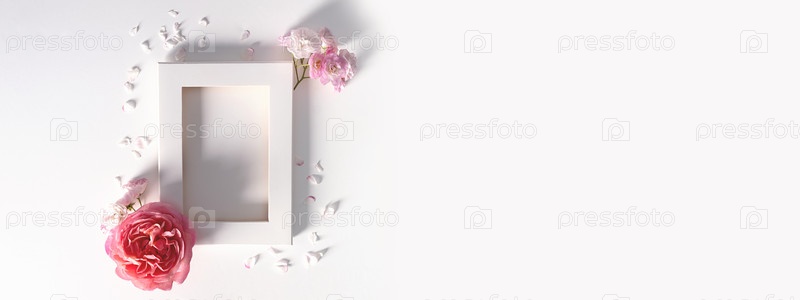 Цветочная рамка из розовых цветов на белом или розовом фоне. Плоская планировка, вид сверху. Концепция весны и лета. Дизайн рамы головы розы ромашки. Пустое пространство. Шаблон романтической открытки