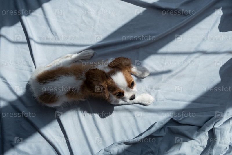 Ой с собакой в обнимку лежит в постели. Спите с домашними животными. милый щенок кавалер кинг чарльз спаниель. ой с собакой в обнимку лежит в постели. Спите с домашними животными. милый щенок кавалер кинг чарльз спаниель. Баннер
