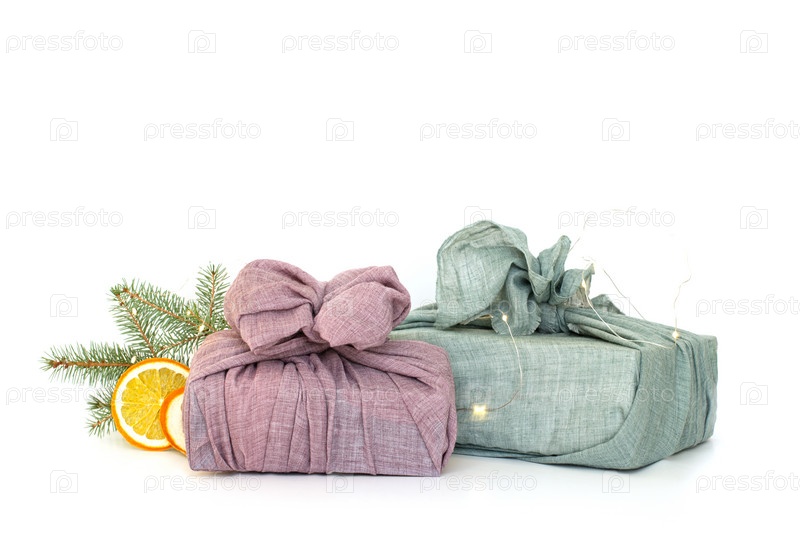 Упаковка подарков в ткань на рождество в стиле фурошики. Экологически чистая концепция. сделай сам, изолировать