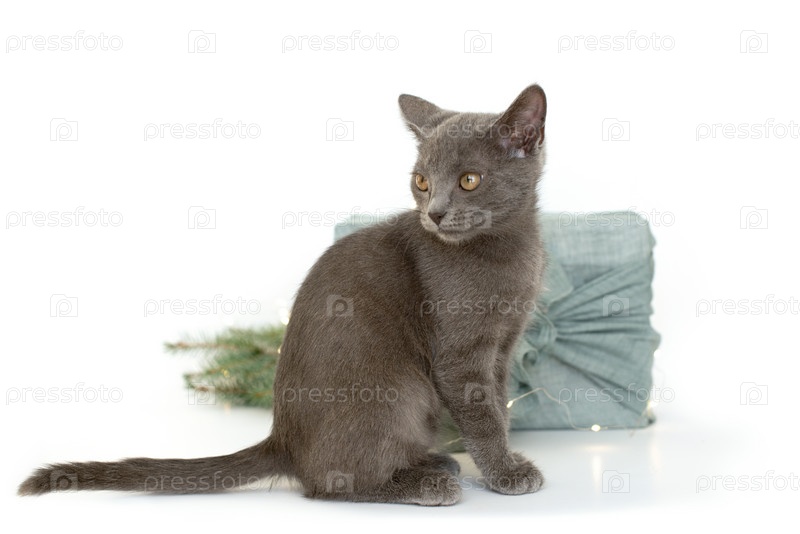 Серый кот и упаковка подарков в ткань на Рождество в стиле фурошики. Экологически чистая концепция. Сделай сам