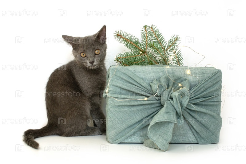 Серый кот и упаковка подарков в ткань на Рождество в стиле фурошики. Экологически чистая концепция. Сделай сам