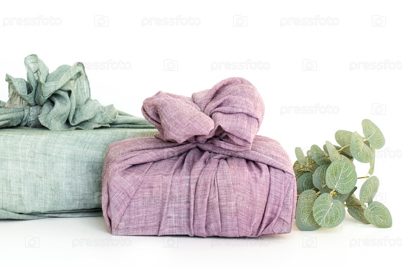 Упаковка подарков в ткань на рождество в стиле фурошики. Экологически чистая концепция. сделай сам, изолировать