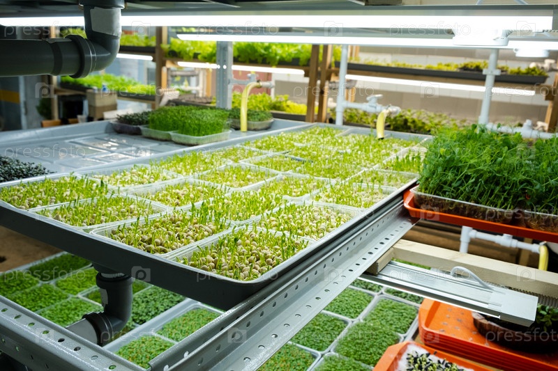 Городская ферма по выращиванию микрозелени. Экологичный малый бизнес. детские листья, фитолампа