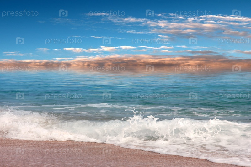 Облака в небе, ярко освещенные солнцем и спокойная гладь океана