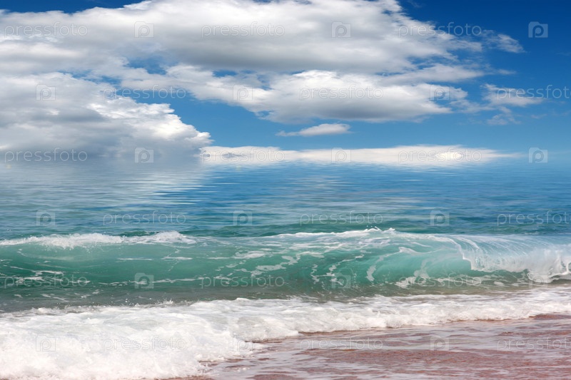 Облака в небе, ярко освещенные солнцем и спокойная гладь океана