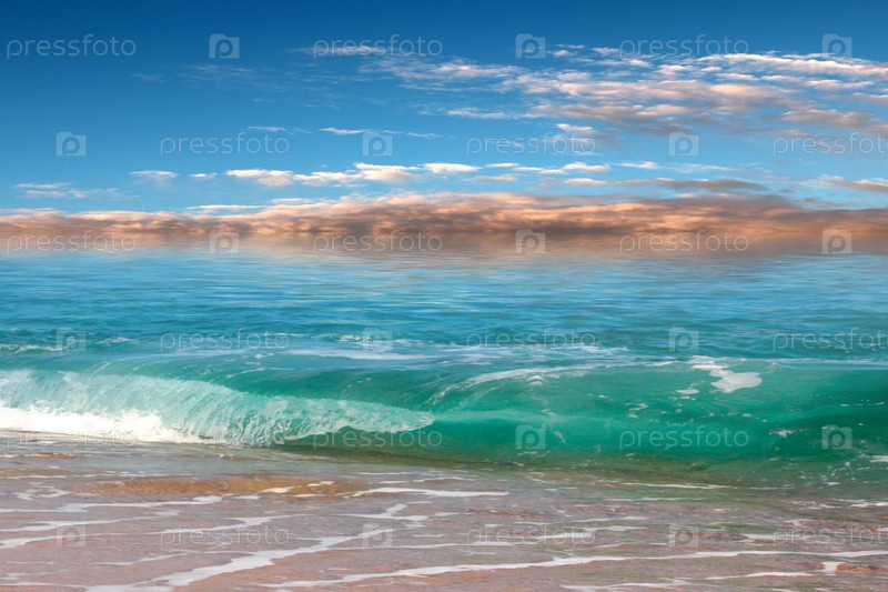 Облака в небе, ярко освещенные солнцем и спокойная гладь океана