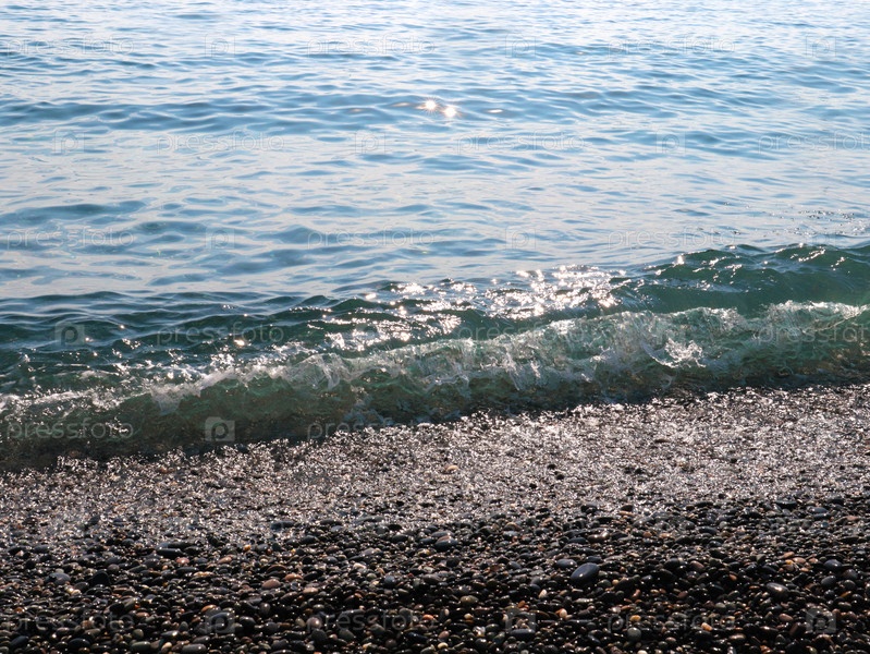 Чистая морская волна падает на галечный пляж в солнечный день