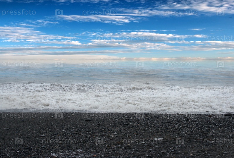Штормовые волны и галечный пляж на берегу моря