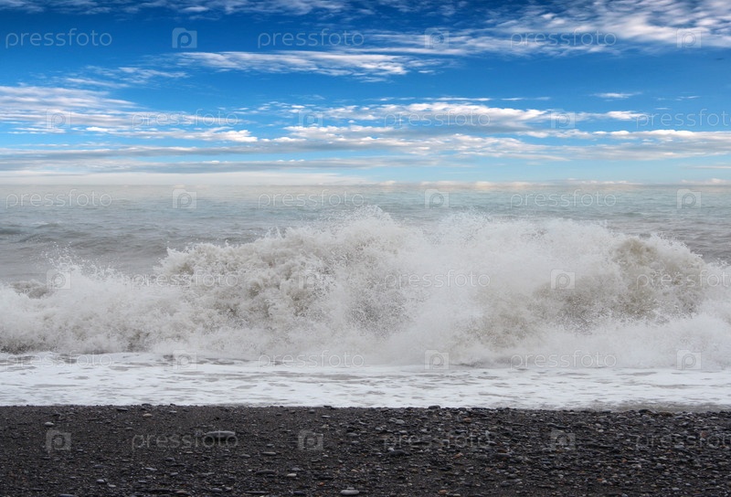 Штормовые волны и галечный пляж на берегу моря