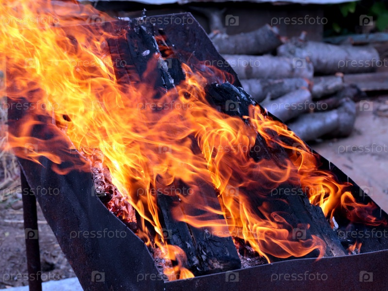 Языки раскаленного пламени в жаровне садового участка