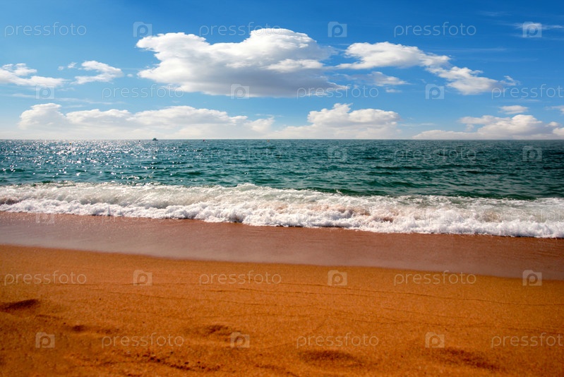 Красивый песчаный пляж средиземного моря и солнечное небо