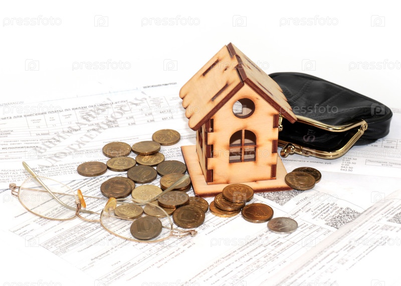 Российский рубль лежит рядом с кошельком на квитанции об оплате коммуналки и деревянного дома