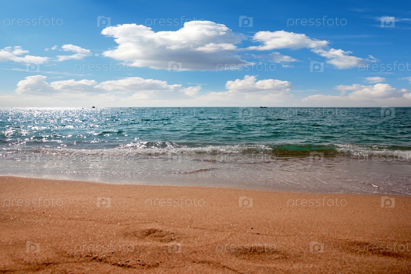 Красивый песчаный пляж средиземного моря и солнечное небо