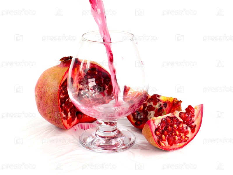 Струйка гранатового сока в стакан и кусочки спелого яркого граната