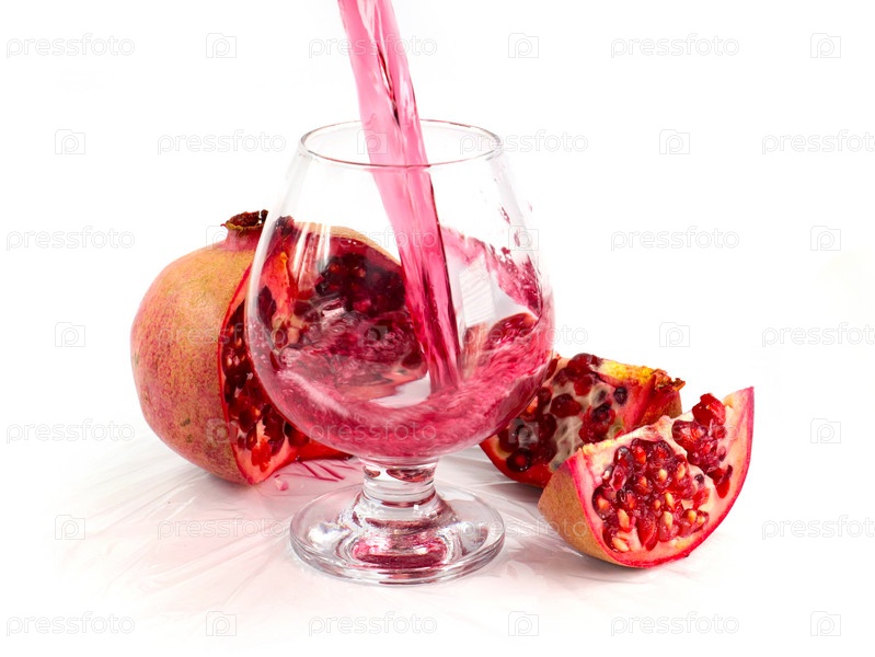Струйка гранатового сока в стакан и кусочки спелого яркого граната