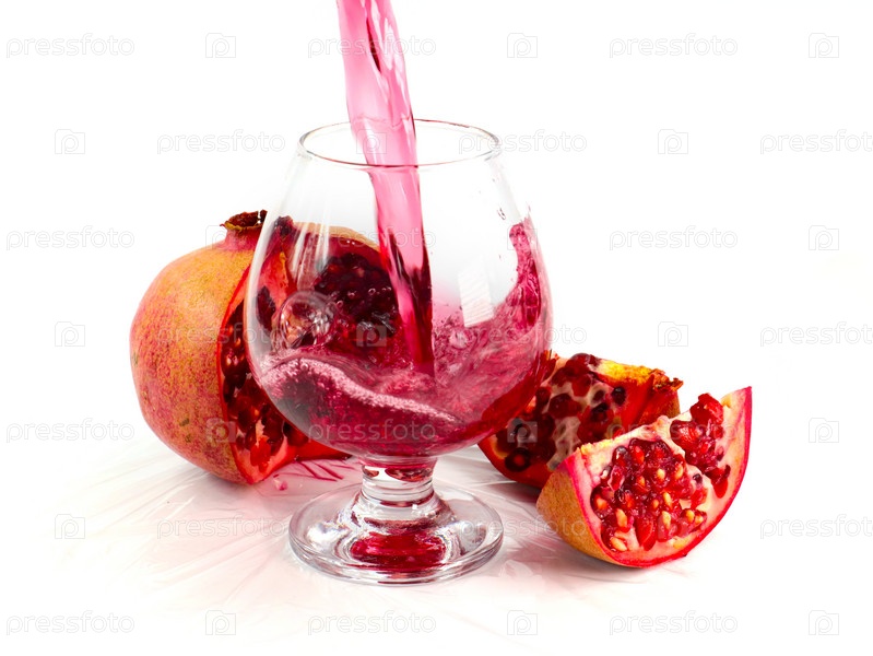 Струйка гранатового сока в стакан и кусочки спелого яркого граната