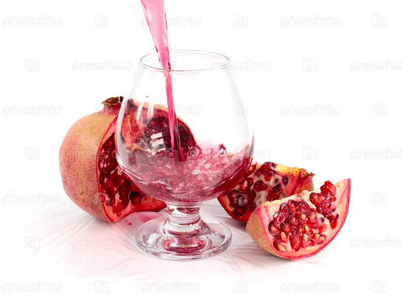 Струйка гранатового сока в стакан и кусочки спелого яркого граната