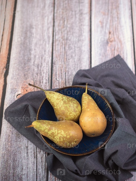 Три груши, разнообразие конференции, на синем блюде на деревянном фоне с копией пространства, вертикально. Фрукты и урожай, тема еды