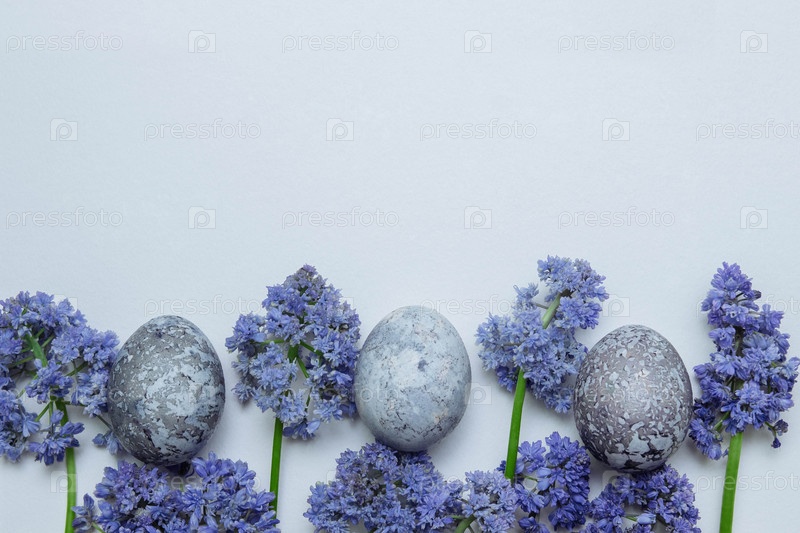 Фиолетовые пасхальные яйца с цветами сирени, мускари и лаванды на белом фоне крупным планом с пустым пространством для текста, копией пространства, плоской планировкой, концепцией поздравительной открытки, традиционным весенним праздником