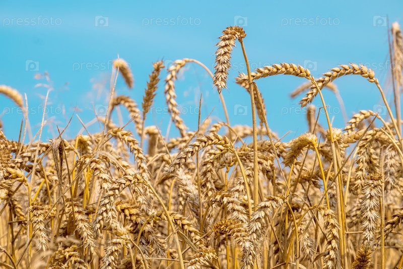 Пшеница. Колосья зерновых культур крупным планом на фоне голубого неба