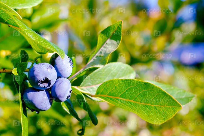 Черника. Темно-синие крупные ягоды крупным планом и зеленая листва