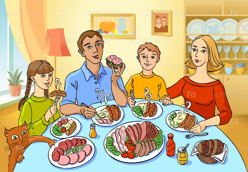 Семья: мать, отец, двое детей и кот обедают за круглым столом в столовой
