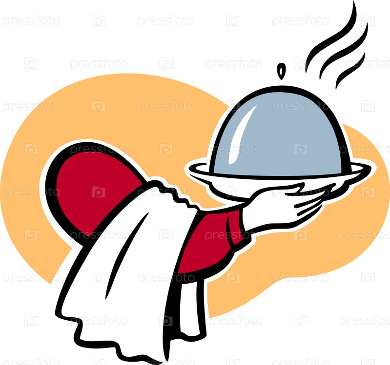 Готовое горячее блюдо под крышкой в руках официанта, цветной вариант