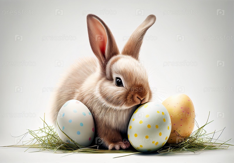 Пасхальный милый кролик сидит на траве, рядом лежат разноцветные яйца. Открытка