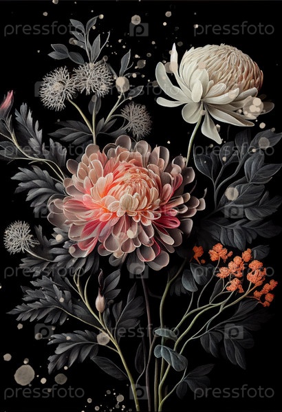 Нарисуйте большие цветы, черный фон. Цветочный принт. Большой букет цветов, ручная роспись маслом. Иллюстрация