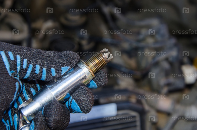 Ремонт машин. Замена свечей зажигания. Старые отработанные свечи, покрытые сажей