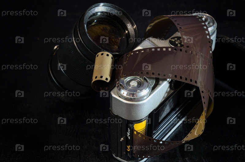 Старая пленочная камера и объектив. Темный деревянный стол
