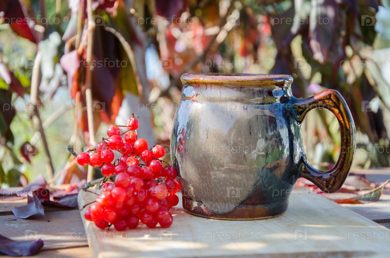 Натюрморт. Глиняная кружка с горячим чаем. веточка калины для украшения