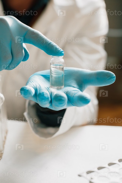 Растительное масло, ученый держит бутылку масла. Лечение травами, Альтернативная медицина. Ампула или флакон с лекарством