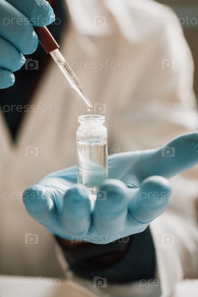 Растительное масло, ученый держит бутылку масла. Лечение травами, Альтернативная медицина. Ампула или флакон с лекарством