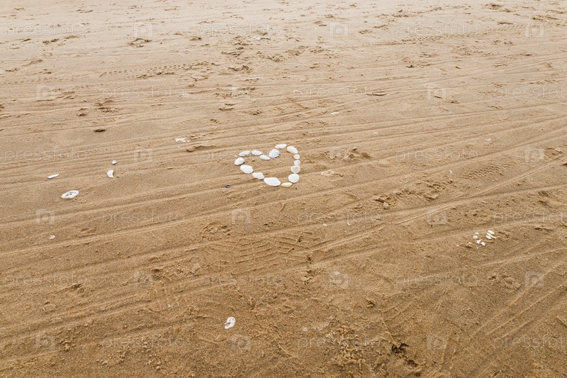 Сердце из морских раковин на морском пляже. Концепция праздничной любви