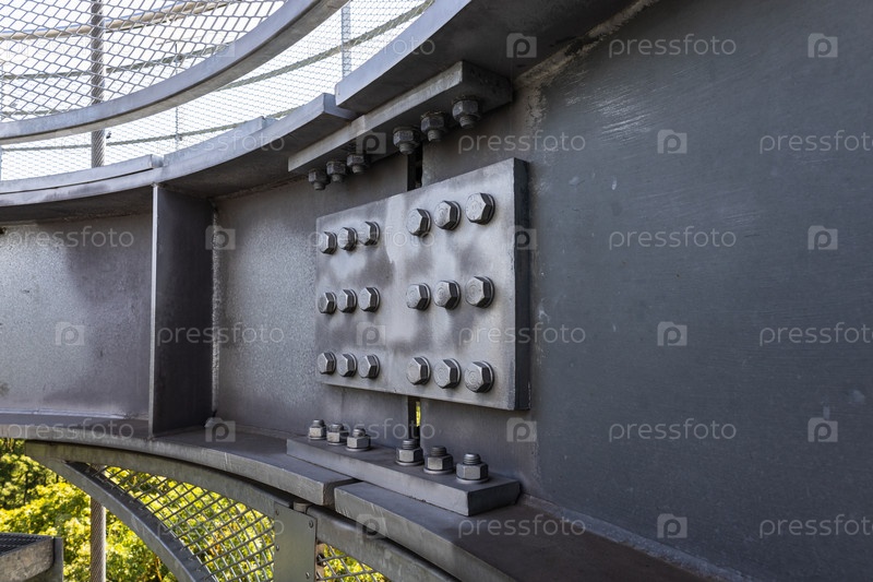 Деталь стальных винтовых болтов, соединяющих массивную промышленную стальную конструкцию